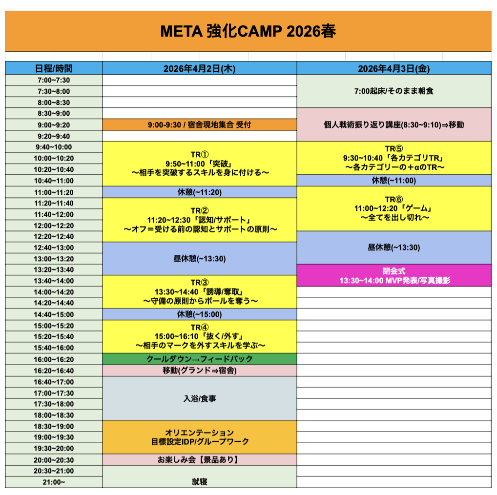 (TR6回、3食付き、戦術/メンタル講座、レクレーション)