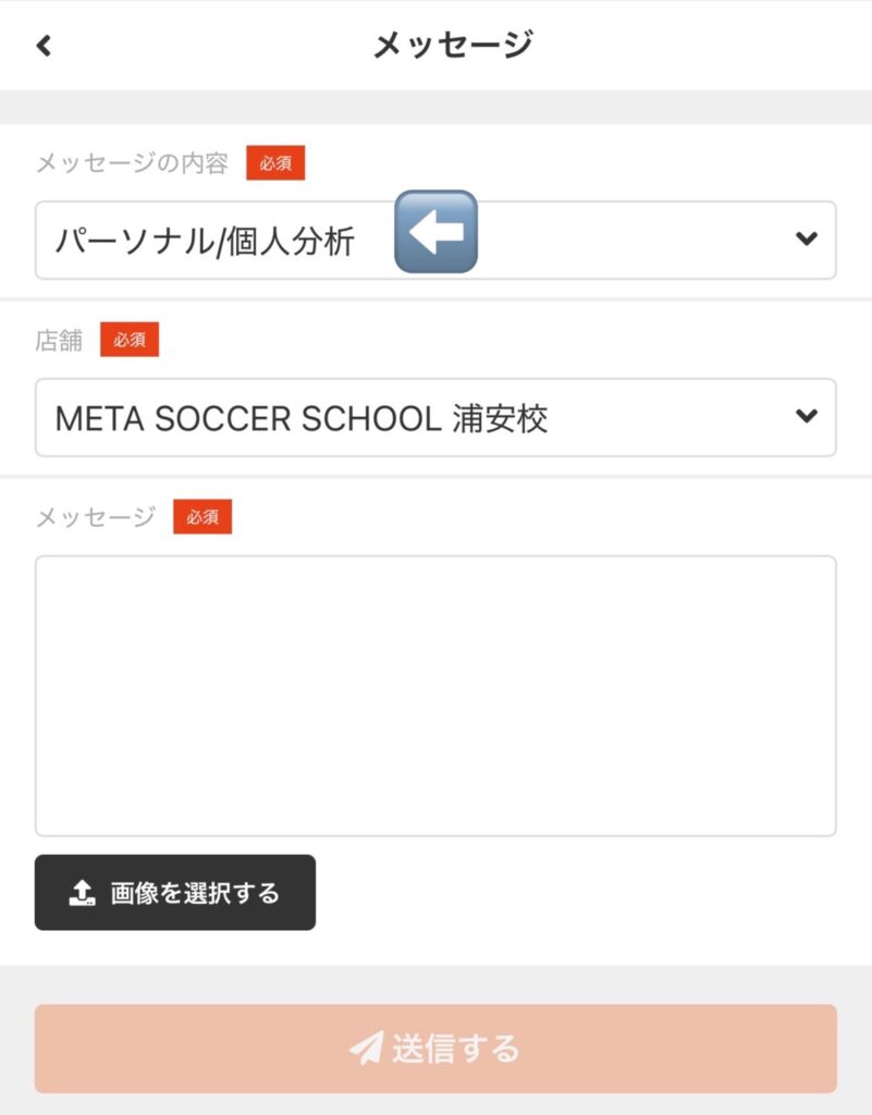 コーチ・希望日時(第3希望まで)・場所・希望内容をHacomonoのメッセージ機能で送信します。