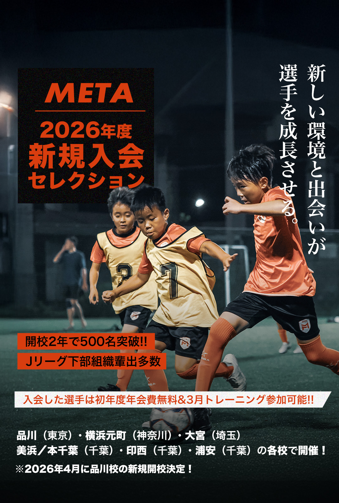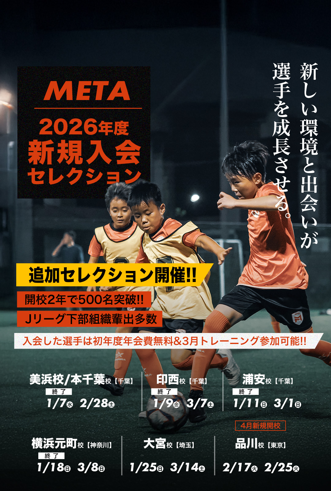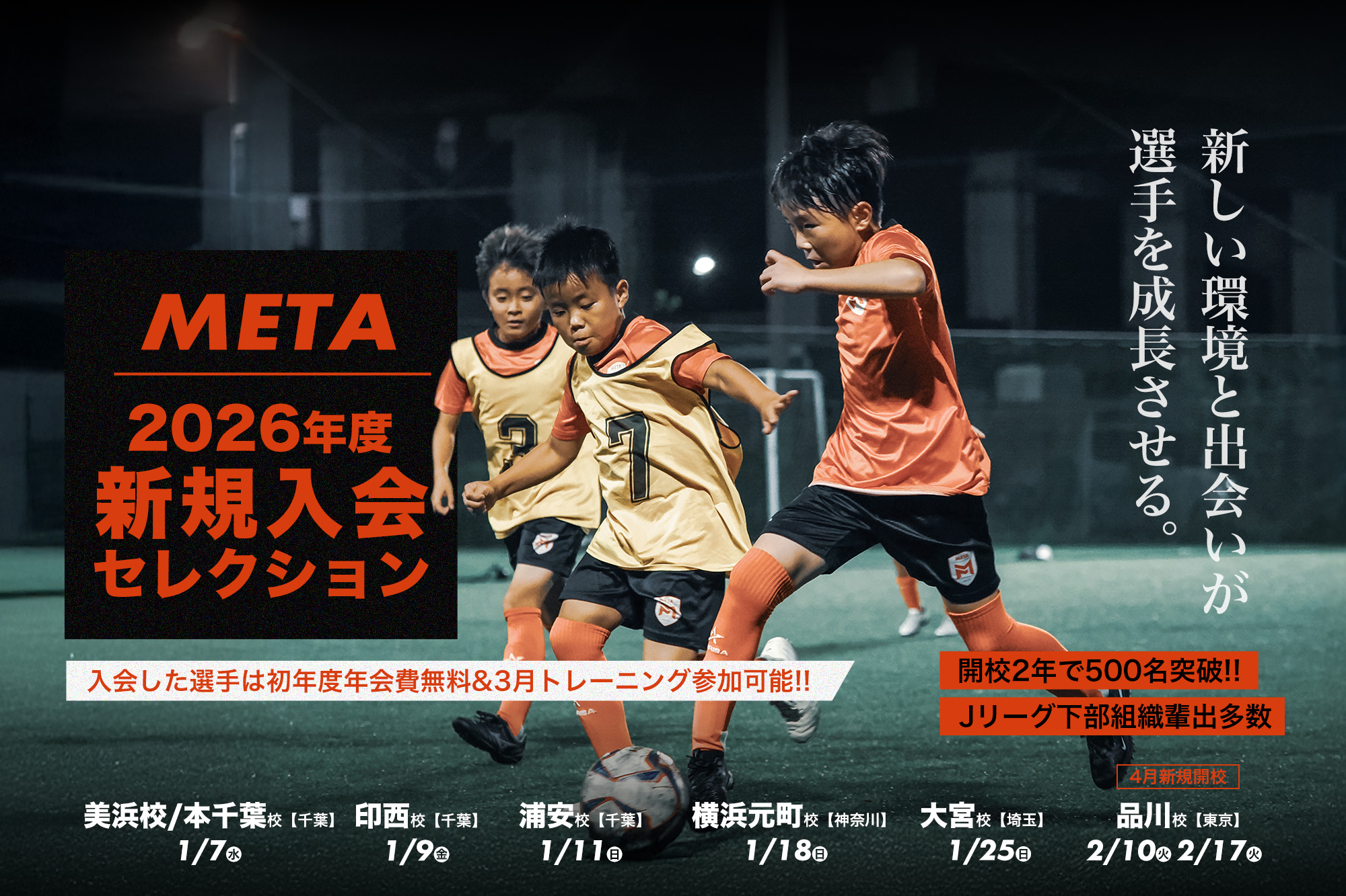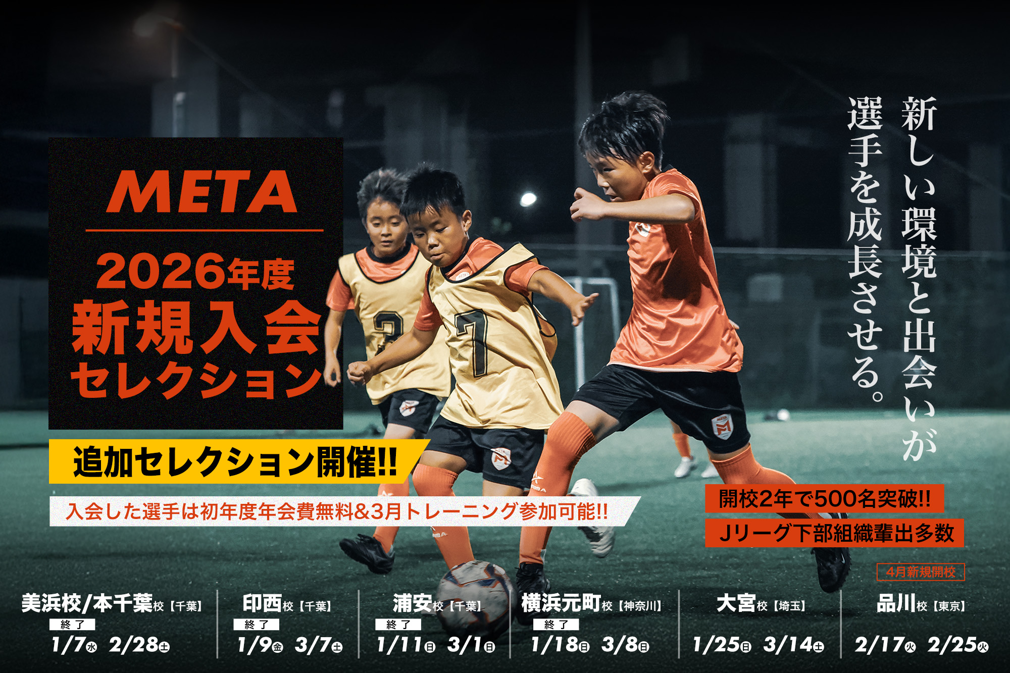 METAサッカースクールでは、新年度に向けた新規入会レクションを開催しています。レベル問わず選抜特進クラス希望者、強化クラス希望者共にまずは入会セレクションにご参加ください。セレクションでは選抜特進クラスor強化クラスのレベルに対してのパフォーマンスを評価し、スクール入会基準を満たされているかをチェックします。